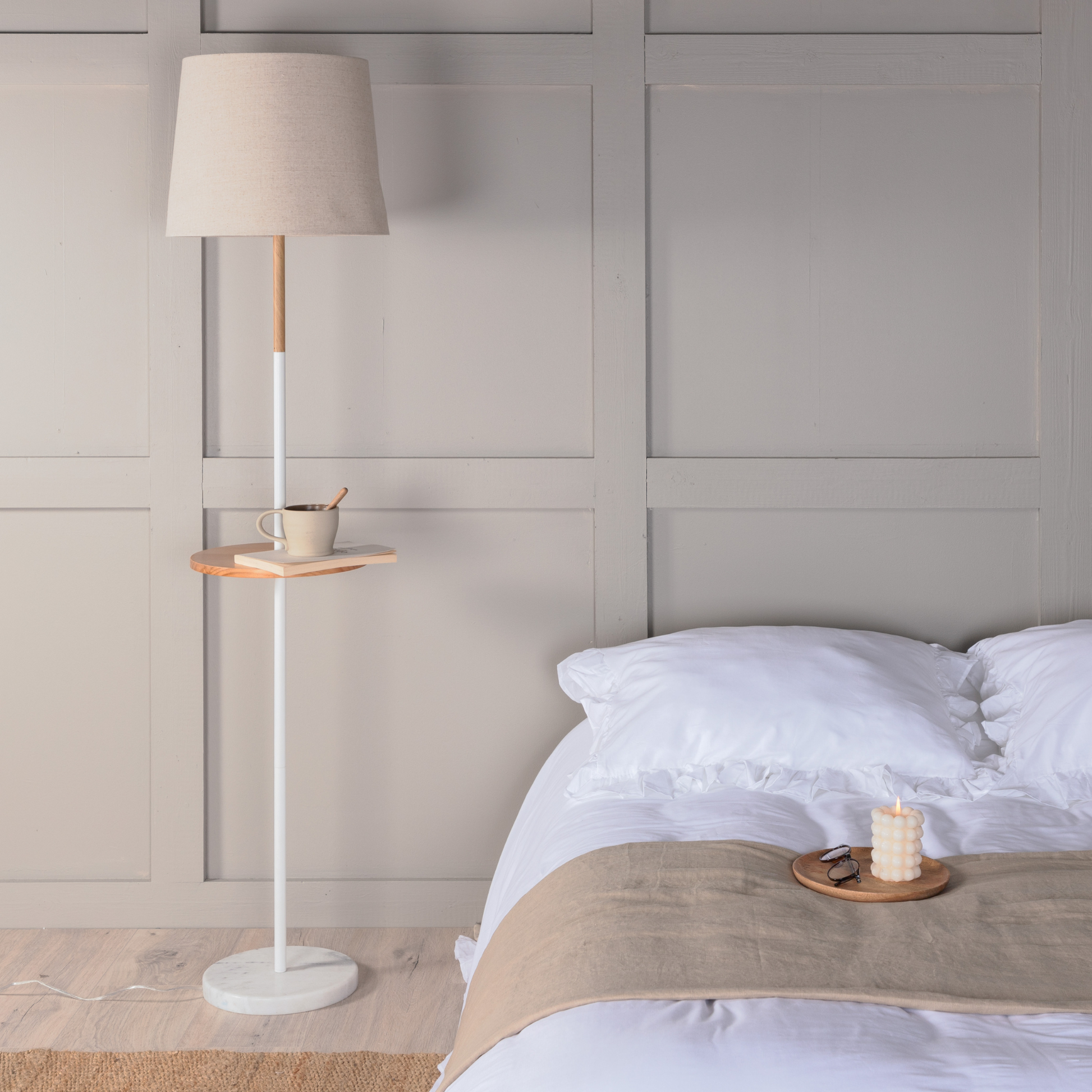 Hattman er en elegant gulvlampe med en fin og simpel lille træhylde. Ideel til læsehjørnet, hvor du kan lægge din bog, eller ved sofaen, hvor du kan stille din kaffekop. En simpel og elegant løsning med hvide trædetaljer, en skærm i polyesterlinned og en fod i hvid marmor.